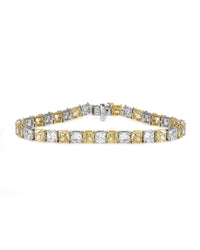 Alternating 14k white and yellow gold baskets holding (23.45ctw) of Yellow VS and F VS square cushion lab diamonds, 7".
