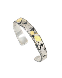 Aspen allure cuff Design with Diamonds and leaves - partially oxidized sterling silver. Leaves are solid 18k gold. (6) diamonds measuring 2.5mm, 2mm, and 1.8mm. Approximately 1/2" wide; internal diameter 2 1/2" x 2" with 1" opening. By Wolfgang Vaatz