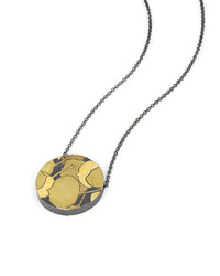 Aspen Leaves Connecting to Earth Pendant crafted of carved, engraved & textured 18k gold/oxidized Sterling silver bi-metal. Pendant measures 1 1/8" on a oxidized sterling silver chain measuring 16” with 3.5” extension. By Wolfgang Vaatz