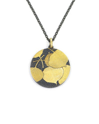 Aspen Leaves Connecting to Earth pendant crafted of carved, engraved & textured 18k gold/oxidized Sterling silver bi-metal, with 18k solid gold bail. Pendant measures 1 1/8" on a oxidized sterling silver chain measuring 16.5” with 3.5” extension. By Wolfgang Vaatz