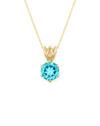 A 14k yellow gold six-prong pendant with a decorative bail holds an 8mm (2.22ctw) round blue-green topaz. Chain not included.