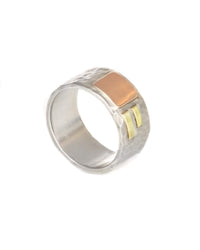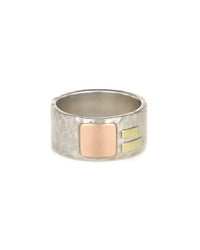 Sterling silver 10mm wide hammered band with 14k rose gold cell and 18k yellow gold strips. Size 9.25. By Emily Johnson