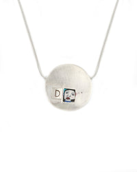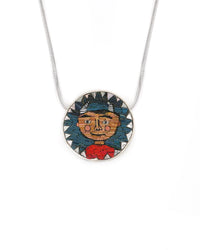 Polymer clay micro-mosaic pendant made by Cynthia Toops set in a sterling silver bezel hand-fabricated by Dan Adams. Pendant measures approximately 1" on a 20 in silver snake chain. By Cynthia Toops and Dan Adams.