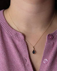 14k yellow gold pendant with a 10x7mm pear shape faceted London blue topaz briolette dangling from a bezel set diamond (0.03ctw) and hinged bail. Pendant hangs 3/4" on a 16-17"adjustable chain