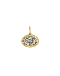 Sterling silver double-sided dog bone charm with Amore meaning "Love" and diamonds (0.056ctw) on the bone with an 18k yellow gold trim. Approximate measurements: 10/16” x 8/16”. Made in New York. By Erica Molinari