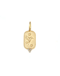 14k yellow gold double-sided small rectangle hummingbird and flowers charm with "Lei Vola Con Le Sue Ali meaning "She flies with her own wings" and 3 granules diamonds (0.03ctw). Made in New York. By Erica Molinari