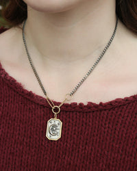 Sterling silver double-sided large rectangle man on the moon charm with "To the moon and back" and 3 granules diamonds (0.03ctw) with an 18k yellow gold trim. Approximate measurements: 1" & 1/8" x 3/4". Made in New York. By Erica Molinari