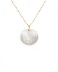 Hammered matte sterling silver eclipse pendant with (1) flush set diamond (0.02ctw) on a 14k yellow gold chain. Pendant measures 3/4" in diameter, on a 18" chain. Crafted using recycled silver. By Toby Pomeroy