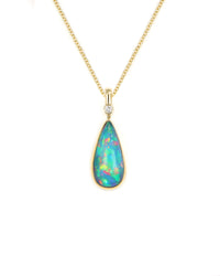 Elongated Drop shape pendant with Ethiopian opal set in 22k gold bezel, and 14k bail with bezel set diamond. . Pendant measures approximately 1". Chain not included. Sourced directly from the Wollo Valley in Ethiopia, these opals are known for their vivid play-of-color and are purchased directly from small miners, supporting local villages. Each gem is polished and set in gold in Tucson, Arizona.