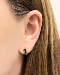 Elongated pear shape green tourmalines (1.25ctw) set in 18k yellow gold bezel contemporary stud earrings. Earrings measure approximately 1/2" (12x5mm), posts.