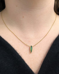 An elongated 1.35ct green tourmaline is set in a sleek, contemporary bezel 18k gold necklace. The pendant hangs approximately 5/8" long from an adjustable 18" chain that can also be worn at 16" or 17".