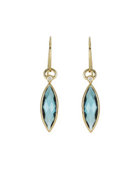 14k yellow gold earrings with faceted marquise shape light London blue topaz and bezel set diamonds (0.03ctw). Earrings hang 1 1/2" from tapered hooks. By Olivia B