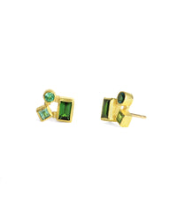 Mixed cut faceted green tourmaline stud earrings set in a cluster set in 22k yellow gold bezels with 18k yellow gold backing. Earrings measure approximately 1/2" (12mm). Made in San Francisco, CA. By Petra Class Studio