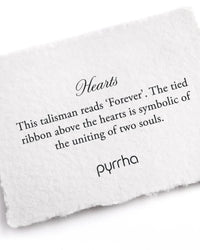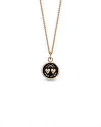 This talisman reads 'Forever'. The tied ribbon above the hearts is symbolic of the uniting of two souls. 14k gold pendant with black ceramic layer. Handcrafted in Vancouver, Canada. By Pyrrha