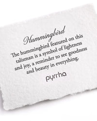 The hummingbird featured on this talisman is a symbol of lightness and joy, a reminder to see goodness and beauty in everything. Sterling silver pendant with black ceramic layer. The talisman hangs approximately 3/4'' on an 18" oxidized silver fine curb 1.5mm chain. Crafted in Vancouver, Canada by Pyrrha.