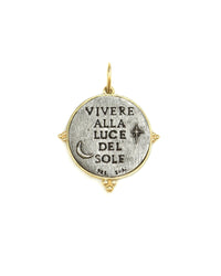 Sterling silver double-sided large sun face charm with "Live in the sunshine" and 3 granules diamonds (0.039ctw) with an 18k yellow gold trim. Approximate measurements: 1" & 1/8" x 3/4". Made in New York. By Erica Molinari