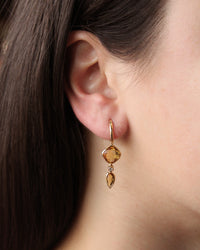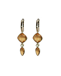 14k yellow gold drop earrings with 8x4mm pear shaped Madera citrine dangling from (0.06ctw) diamonds and faceted cushion shaped Madera Citrine Briolette (8mm). Earrings hang approximately 1"on hinged "J" hoops. By Olivia B