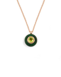 14k rose gold necklace with malachite and bezel-set peridot. Pendant measures slightly over 3/8" on a 17" rose gold chain. Made in Italy. By Peroni & Parise