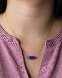 14k yellow gold marquise shaped lapis lazuli bezel set in delicate 17" necklace. Lapis center measures 1"x 3/8". By Olivia B