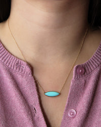 14k yellow gold marquise shaped Turquoise bezel set in delicate 17" necklace. Lapis center measures 1"x 3/8". By Olivia B
