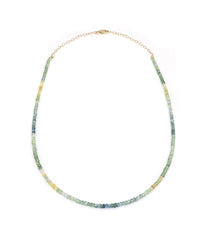 17" necklace of faceted Montana sapphire in shades of blue, teal, and golden green. Finished with a 14k yellow gold chain. Perfect worn on its own or layered with your favorite necklaces.
