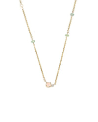 Custom 14kt yellow cable chain scattered "constellation necklace". A total of (4) white seed pearls and (10) blue and green Montana sapphire beads are spaced asymmetrically throughout the chain. At the center sits (1) 4-prong set round cabochon cut white opal and (1) 4-prong set princess cut diamond melee. This necklace is a total length of ~17" and finished in a high polish. Designed and made in the Bellevue studio of Green Lake Jewelry Works.