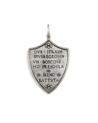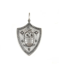 Oxidized silver double sided Moon + Stars Owl Charm. Approximate measurements: 1" x 1/2" x 15/16". With quote “Two roads diverged in a wood and I took the one less traveled" by Robert Frost on the back. Made in NYC. By Erica Molinari