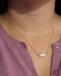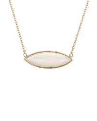 14k yellow gold marquise shaped mother of pearl bezel set in delicate 17" necklace. Lapis center measures 1"x 3/8". By Olivia B