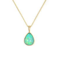 Pear opal drop shape pendant with Ethiopian opal set in 22k gold bezel and 14k bail. Pendant measures approximately 3/4". Chain not included. Sourced directly from the Wollo Valley in Ethiopia, these opals are known for their vivid play-of-color and are purchased directly from small miners, supporting local villages. Each gem is polished and set in gold in Tucson, Arizona.