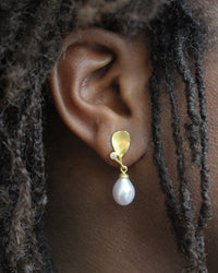 18k yellow gold earrings with white pearl drop and marquise leaf emelents with diamond acccent (0.08ctw). Earrings hang approximately 1 1/8" on hooks or 28 x 9 x 9mm. By Liaung Chung Yen