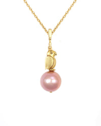 18k Yellow Gold Fable Animals and Strange Characters. One of a kind Pendant with 12mm pink freshwater pearl. Pendant hangs 1 1/2". Chain sold separately. Designed by Alex Sepkus, made in New York