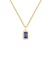 Radiant cut blue sapphire (0.50ctw) in a brushed 18k yellow gold bezel charm pendant. The pendant hangs approximately 5/8" including bail. Chain not included.
