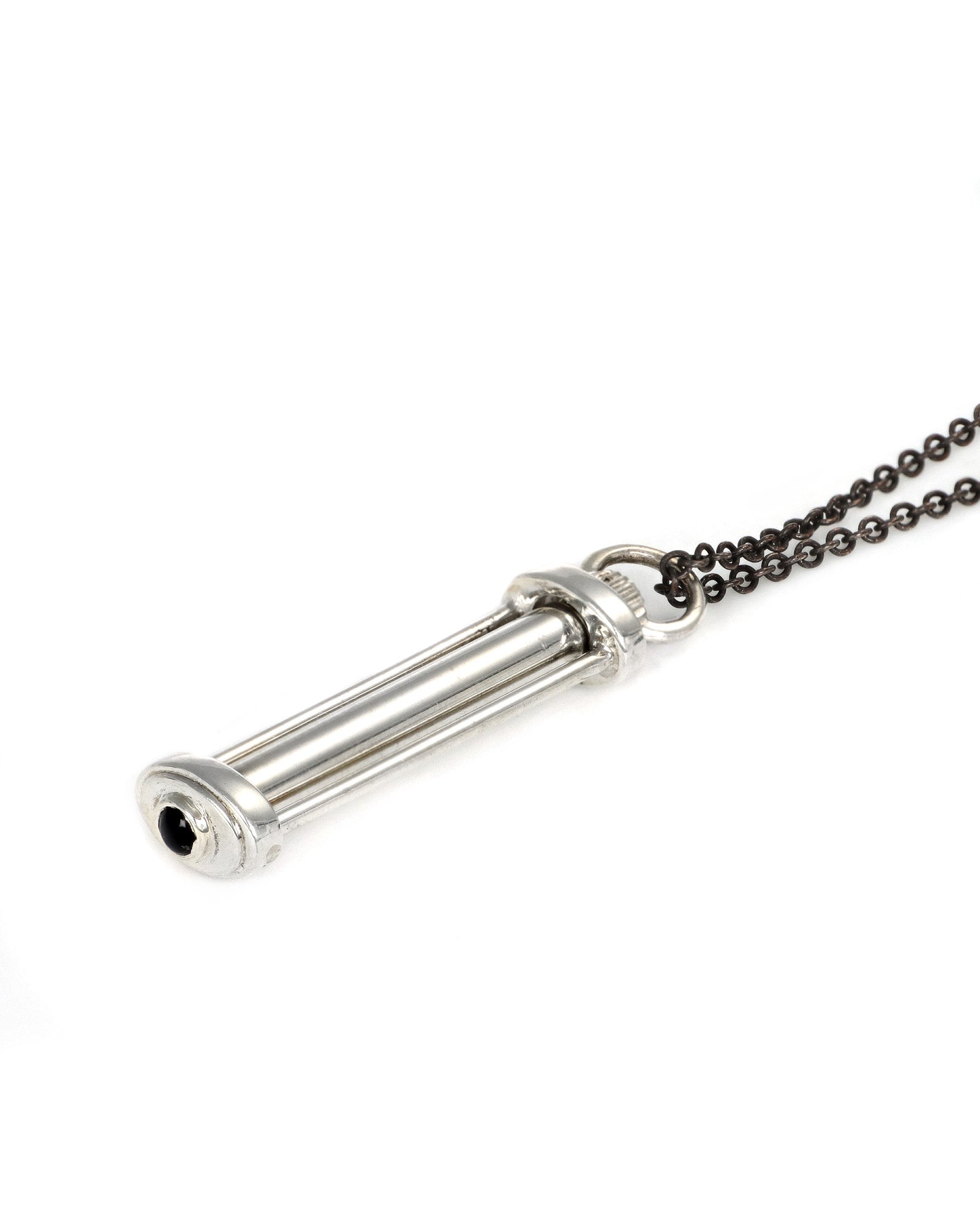A column of gold spins centered along the length of this kinetic pendant. The perfect size for rolling between your fingers, this pendant is designed to channel nervous energy into a grounding, centering calm. A swiveling stop-watch inspired bail adorns the top, an ode to the artist's love for vintage mechanics. Sterling silver and onyx cabochon. Pendant hangs 1 1/2" on a 24" oxidized chain. By Emma Brooke