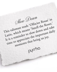 This talisman reads 'Olfacies Rosas' in Latin, which means 'Smell the Roses.' It is a reminder to slow down and take time to appreciate the important daily moments that bring us joy. Sterling silver pendant, handcrafted in Vancouver, Canada in recycled sterling silver. On 18" oxidized sterling silver chain. By Pyrrha