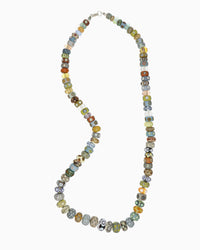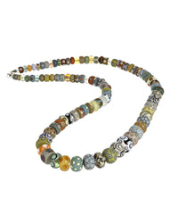 Multicolor Grey/Yellow Necklace featuring hand-crafted glass and polymer beads. Approximately 29 in length. Largest bead approximately 1/2 in diameter. By Cynthia Toops And Dan Adams