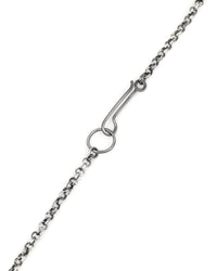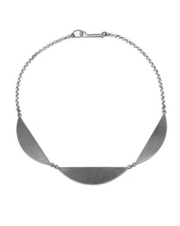 Oxidized sterling silver scalloped necklace with link chain, 18 inches in length. Each of the three scallop elements is approximately 2 1/2 to 2 3/4 inches long. By Elisa Bongfeldt.
