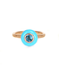14k Rose Gold ring with turquoise and bezel-set London blue topaz. Approximately 1/2" across on a 2mm domed band. Size 6.5. Made in Italy. By Peroni & Parise