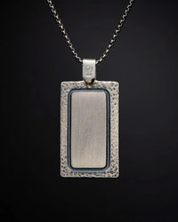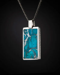 This mini dog tag necklace holds a piece of turquoise inlaid into sterling silver with an engravable panel on the reverse side on a 24" sterling silver box chain. By William Henry