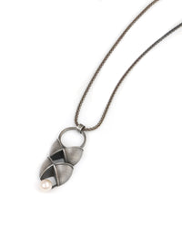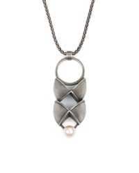 Brushed sterling silver architectural "XXO" necklace with 4.5mm pearl. Pendant hangs 1 3/4" x1/2" on a 20" sterling silver wheat chain. By Jude Clarke
